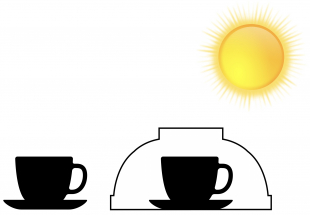 - Stelle die beiden mit Wasser gefüllten Tassen in die Sonne. Stülpe über eine der beiden Tassen die Glasschüssel.