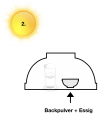 - Diesmal streust du einen halben Teelöffel Backpulver in ein kleines Gefäß. Gieße etwas Essig dazu. Stülpe über das kleine Gefäß mit Essig und Backpulver und das Glas mit dem Wasser das große Glasgefäß.