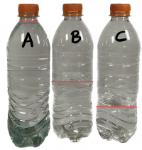 - Fülle drei gleichgroße Flaschen mit unterschiedlich viel Wasser. Eine Flasche (Flasche A) füllst du randvoll mit Wasser und legst zusätzlich 10 Murmeln hinein. Die zweite Flasche (Flasche B) füllst du etwas mehr als halbvoll mit Wasser und die dritte (Flasche C) nur noch etwa zu einem Viertel voll. Wiege jede Flasche und notiere dir die Gewichte in einer Tabelle.