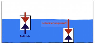 Ist das Drücken des Wassers, also die Auftriebskraft, kleiner als die Anziehung von der Erde, sinkt der Gegenstand. Das ist dann der Fall, wenn das Gewicht des verdrängten Wassers niedriger ist als das Gewicht des Gegenstandes. Ist das Drücken des Wassers, also die Auftriebskraft, gleich groß wie die Anziehung der Erde, schwimmt der Gegenstand. Das ist dann der Fall, wenn das Gewicht des verdrängten Wassers gleich wie das Gewicht des Gegenstandes ist. Ohne Auftriebskraft im Wasser, würden alle Gegenstände zu Boden sinken. Der Auftrieb im Wasser wirkt der Anziehung der Erde entgegen.