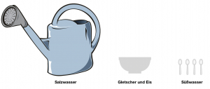 Um dir das besser vorzustellen, kannst du die Wassermengen der Erde mit einer Gießkanne vergleichen, in die zehn Liter Wasser passt. Die Gießkanne wäre fast randvoll mit Salzwasser gefüllt. Das Süßwasser, welches als Eis am Nordpol und Südpol und in Gletschern vorkommt, entspricht etwa einer kleinen Schüssel. Das Süßwasser, welches als Grundwasser und in Seen und Flüssen vorkommt, entspricht in etwa vier Teelöffeln Wasser.